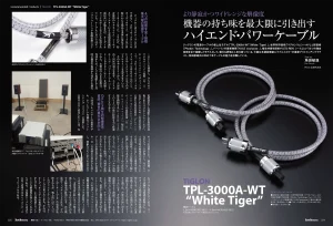 TIGLON社の最上位モデル「TPL-3000A-WT(White Tiger)」は外部からのノイズを遮蔽する世界特許技術「マグネシウムシールド」と、安定したエネルギー伝送を実現する特許申請中の新技術「Photon Technology 」、バーンインの最新技術「H.S.E exclusive 」、複合共振を抑制する「D REN シース」4つの独自技術を全て搭載。TIGLON社15 年間の結晶となるフラッグシップ電源ケーブルが完成しました。